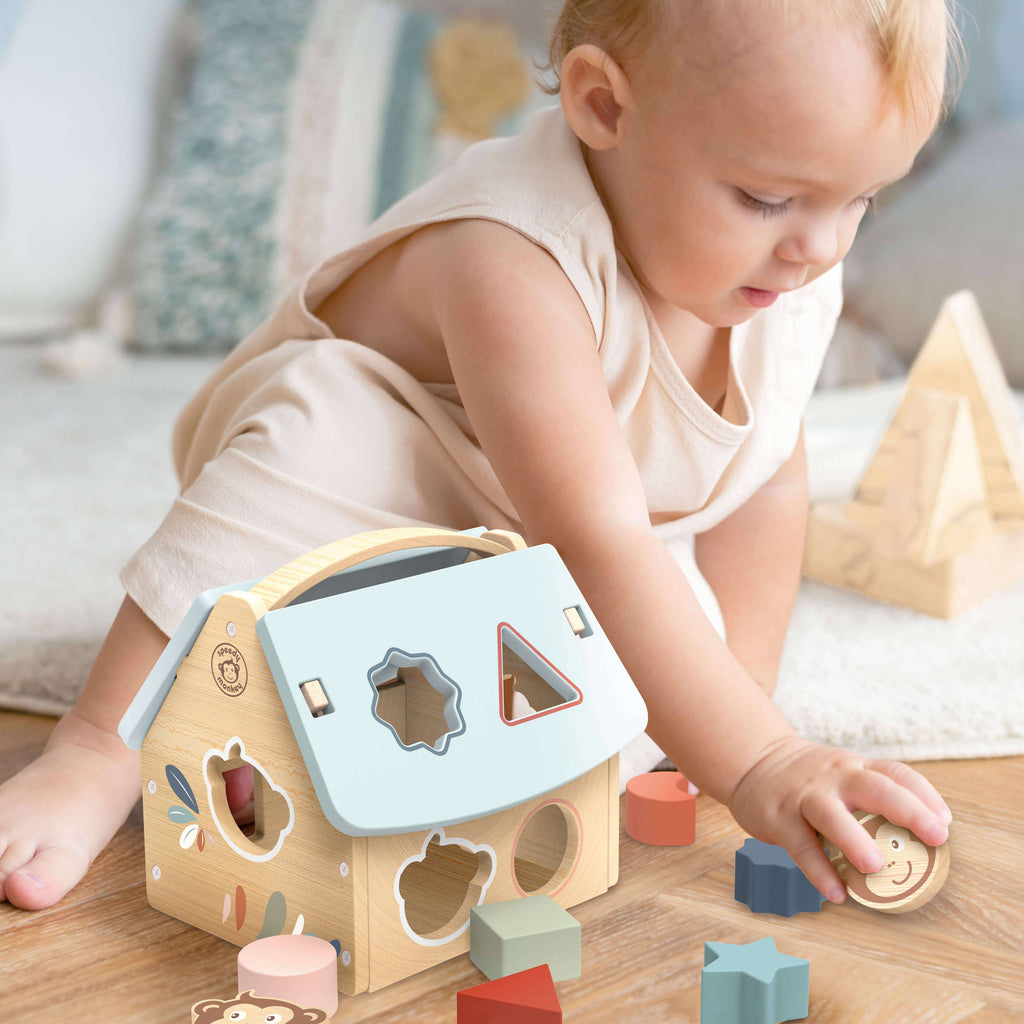 Great for learning to recognise shapes this gorgeous house shape sorter house also includes our very own cheeky monkey for extra fun! Build motor skills by learning to push the blocks through the different shaped slots - and problem solving when retrieving via the removable roof. A classic early learning toy for toddlers which helps build skills in building, stacking, sorting and counting. This toy is crafted from sustainably sourced wood from FSC® certified forests and coated with non-toxic paint.
