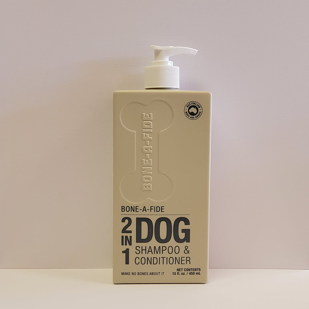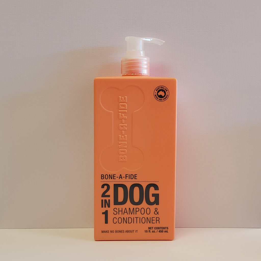 Clean Dog Bone-A-Fide 2 in 1 Conditioning Dog Shampoo offers the convenience of a shampoo and conditioner in one easy step.