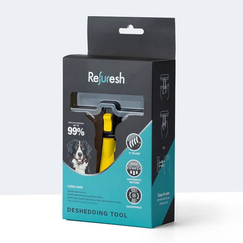Unpack your new Refuresh Deshedding Brush, go fetch your furry friend, and begin their at-home grooming journey.