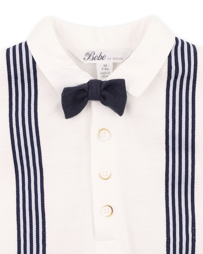 This dressy gentleman romper is all you need for a special occasion, the all in one outfit features a shirt top complete with mock braces and bow tie and contrast knit bottom pant keeping baby looking stylish and comfortable.
